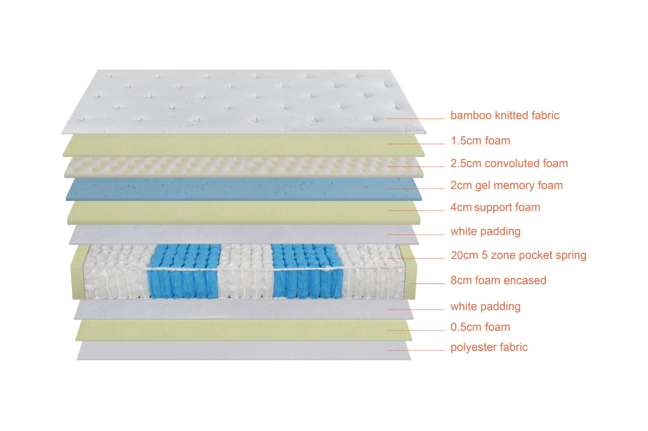 - Transitional layered pocket springs arranged in weight activated support zones.